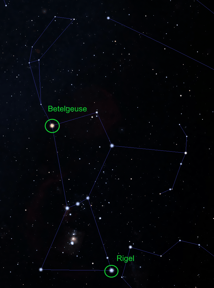 Den ene tåen (eller det venstre kneet om du vil) til Orion heter Rigel. Den er mye varmere enn Betelgeuse som gjør at Rigel har et blåhvitt lys, og er den mest lyssterke stjernen i stjernebilde Orion.